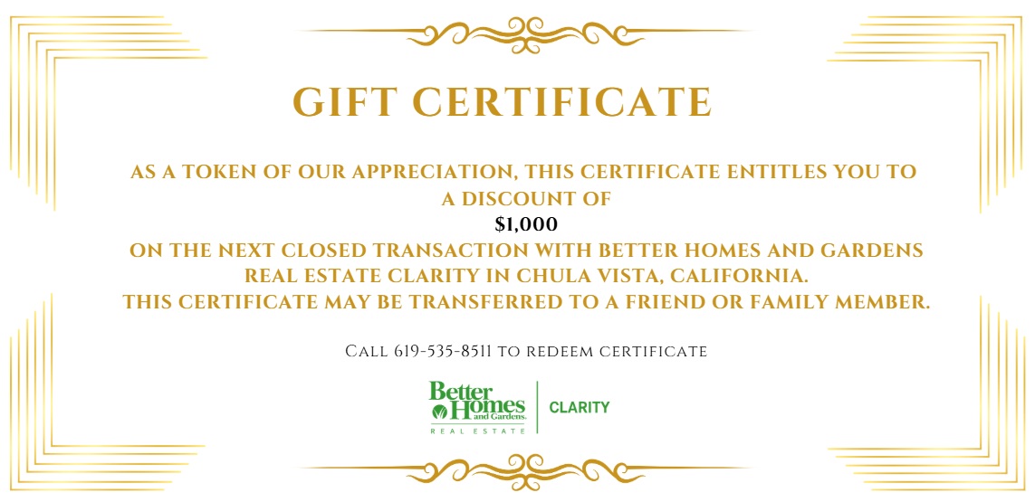 Certificate may be used by buyers or sellers working with a licensed Realtor associated with Better Homes and Gardens Real Estate Clarity and must be presented at the time of contract to buy or sell.
